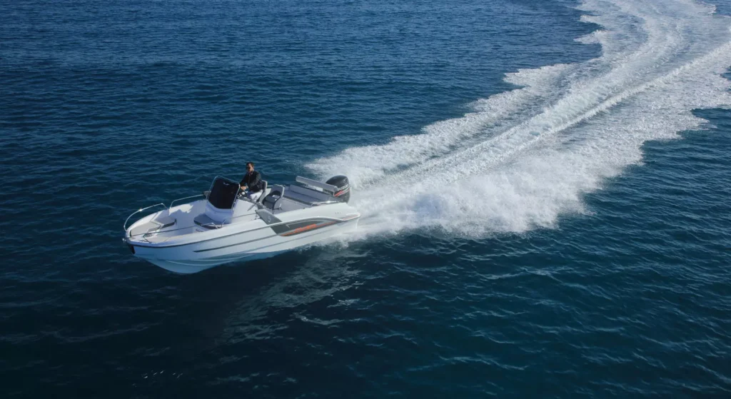 De aspecto elegante, el Flyer 6.6 SUNdeck posee un estilo deportivo destacado por montantes laterales perfilados y un dibujo de parabrisas incisivo. Favoreciendo claramente las adaptaciones de cubierta, esta versión maximiza todos los espacios dedicados a la relajación. Su casco específico en V muy estrecho a la proa, deflecta perfectamente el agua. La línea lateral marrón caracteriza el Flyer SUNdeck.