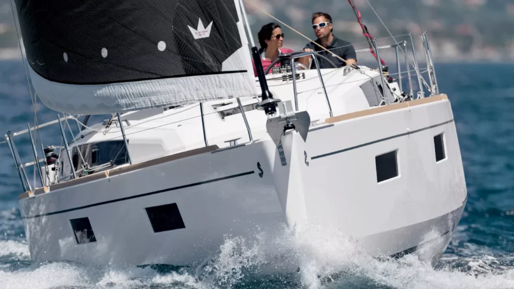 La carena de pantoques del Oceanis 38.1 propone una comodidad de navegación totalmente sorprendente. Bien tenso a la popa, completamente plano sobre el agua, este crucero posee una rigidez en la tela que lo lleva rápido y lejos con una estabilidad excepcional.